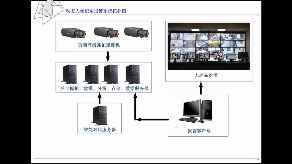 基于人脸识别的人员卡口监控系统逐步取代传统模式的视频监控,采集人脸图像,同时存入云计算平台比对识别。实现人员的黑名单预警及轨迹刻画,并将拍摄照片共享到各个前端采集点,全城布控。本平台采用云计算技术、具有集中认证,集中管理,集中存储,流媒体转发,电子地图,多种报警预案处理等功能外,同时***集成了人脸识别比对等智能功能,把传统的被动监控转变成主动监控,形成***的布防追逃功能,具体很强的实用性及威慑力。